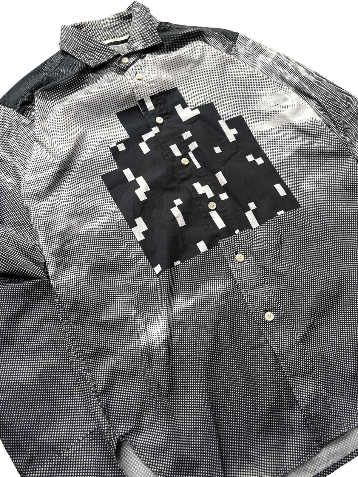 Cav Empt long-sleeved cotton shirt featuring a bold central graphic panel with abstract pixel-style print. Subtle all-over micro pattern with contrasting shoulder detail.