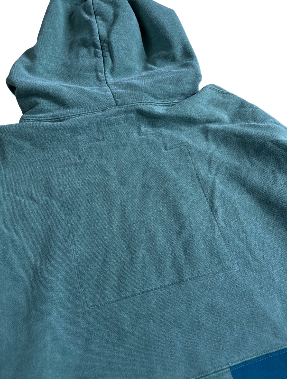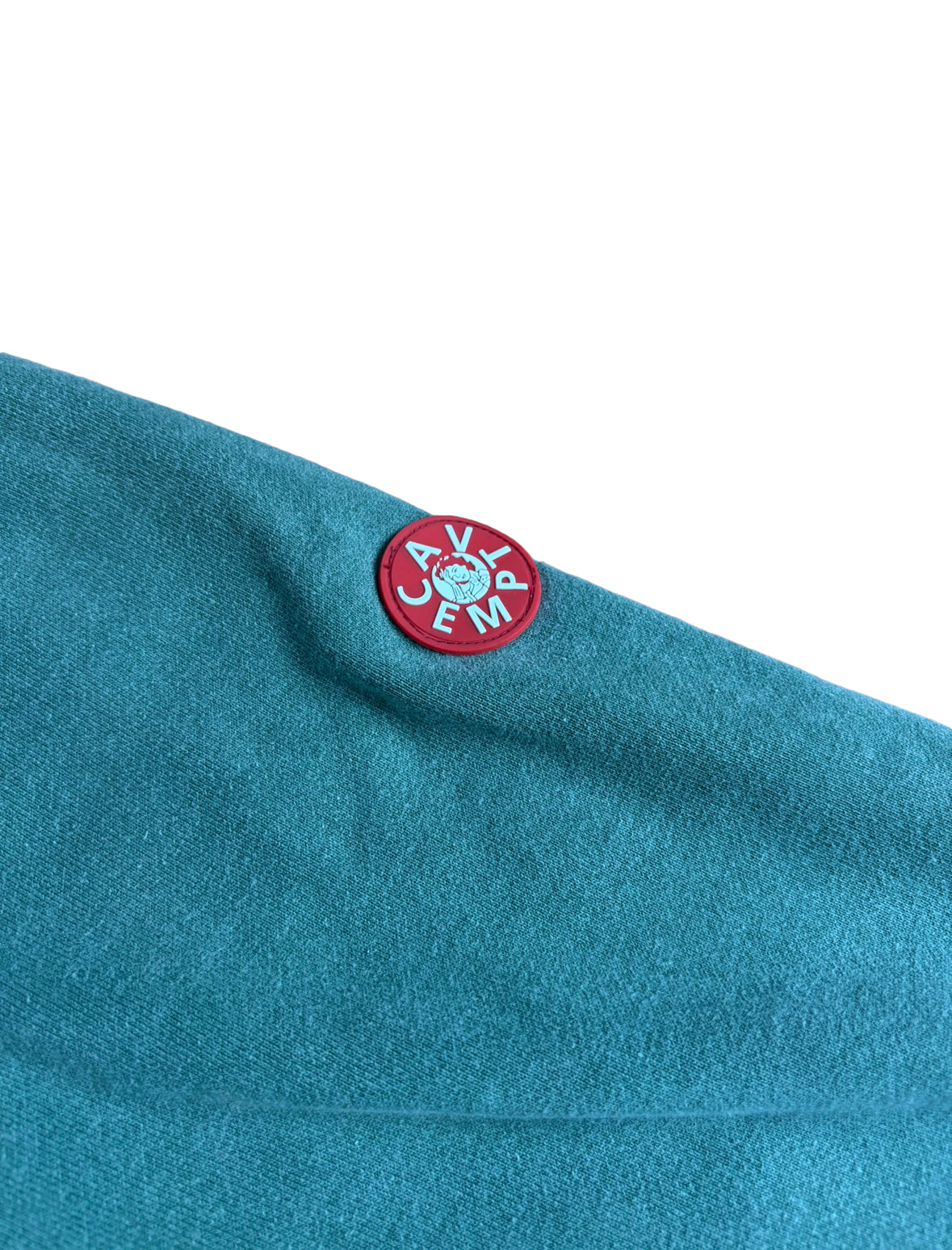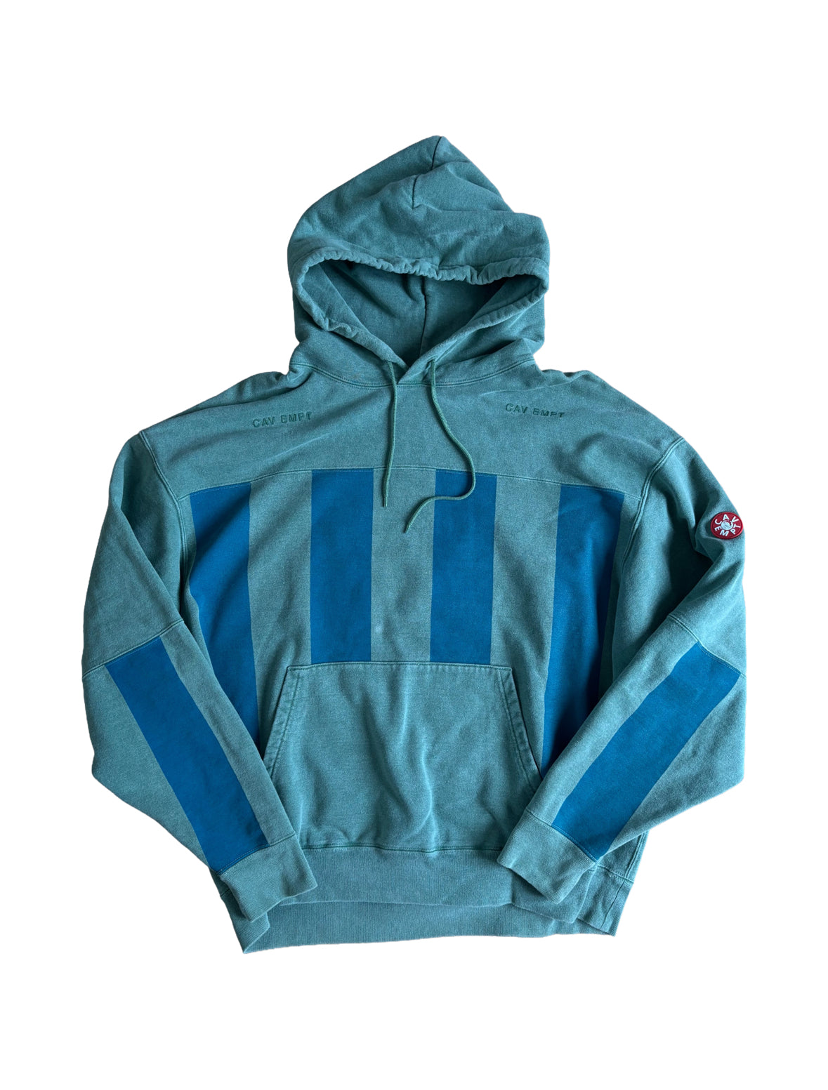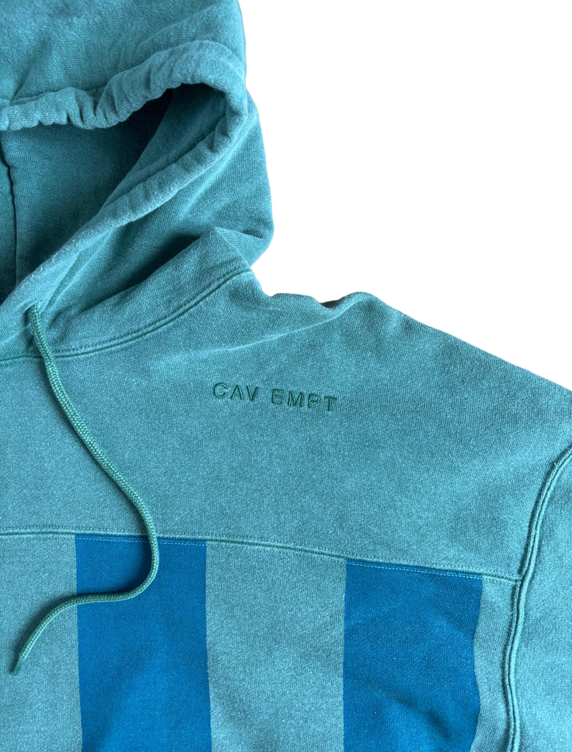 Heavyweight teal hoodie with blue stripes consistently placed throughout design. Cav Empt logo patch on arm, hoodies in really good condition no notable flaws whatsoever