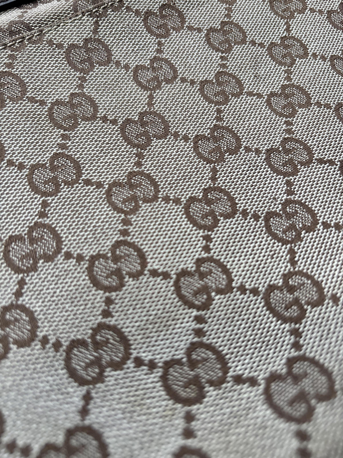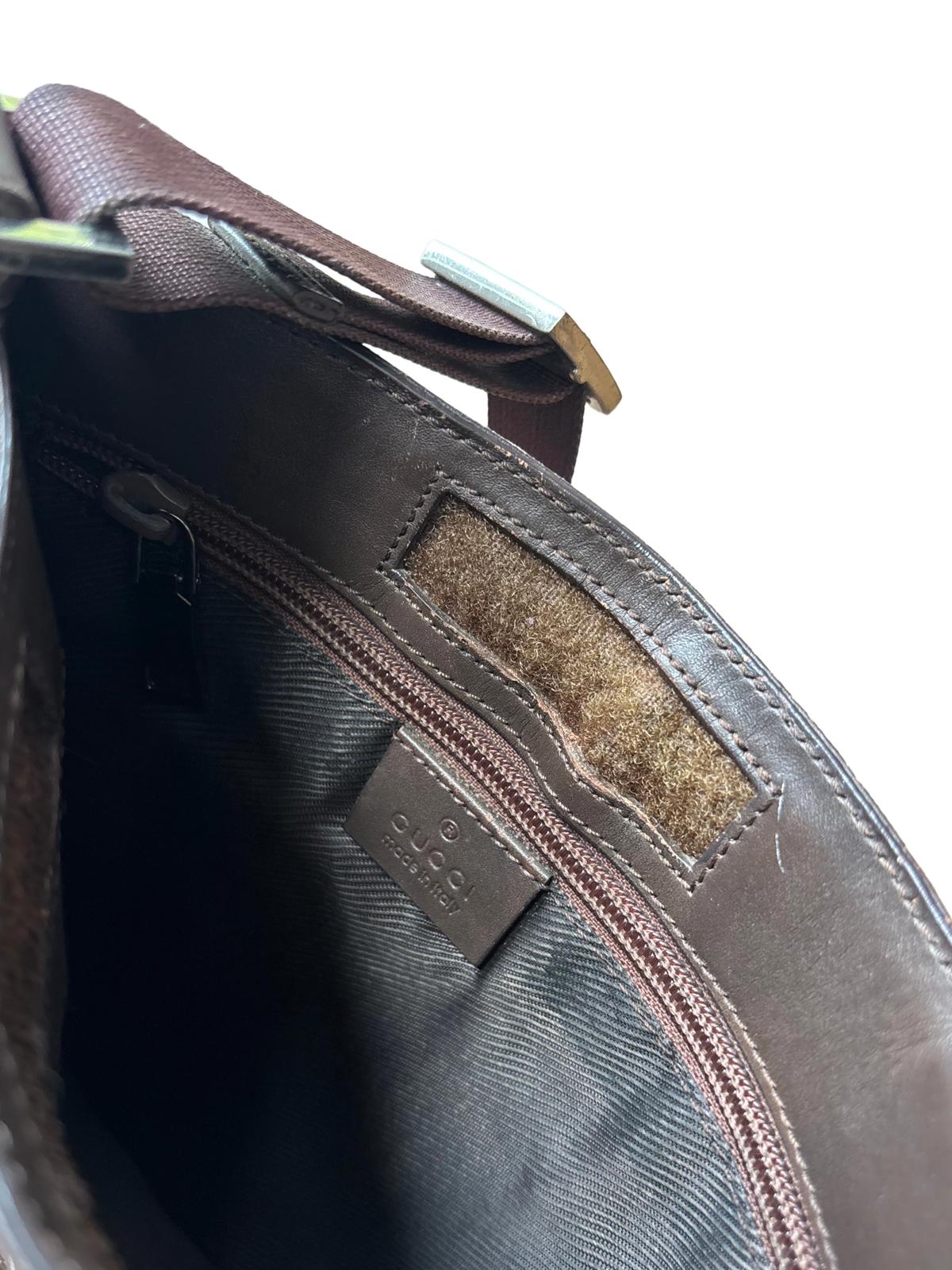Gucci crossbody shoulder bag in the iconic GG monogram canvas with brown leather trim. Slim, structured profile that sits flat on the body — easy everyday luxury piece.
