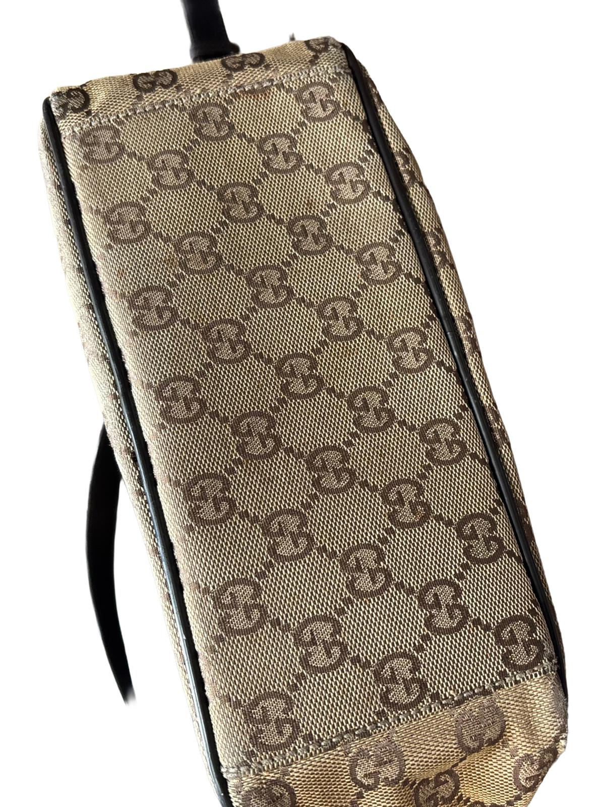 Classic Gucci crossbody bag featuring the iconic GG monogram canvas with dark brown leather trim and adjustable shoulder strap.