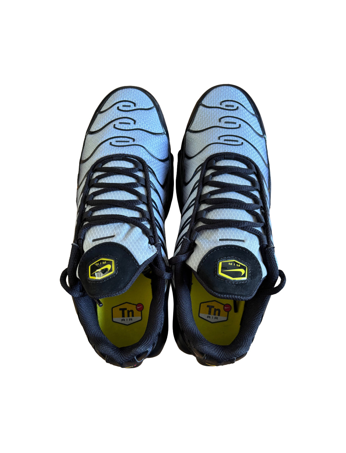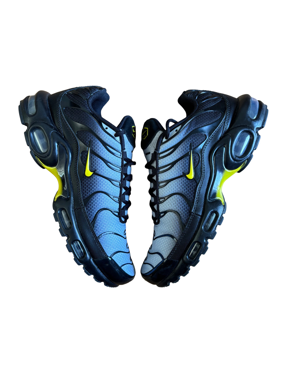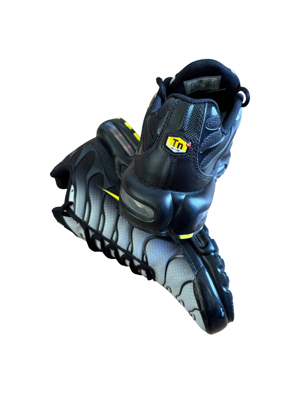 A classic Air Max Plus TN in a crisp black and grey base with bright yellow highlights popping through the overlays and branding. Sleek yet bold — perfect for when you want something subtle but with a bit of edge.