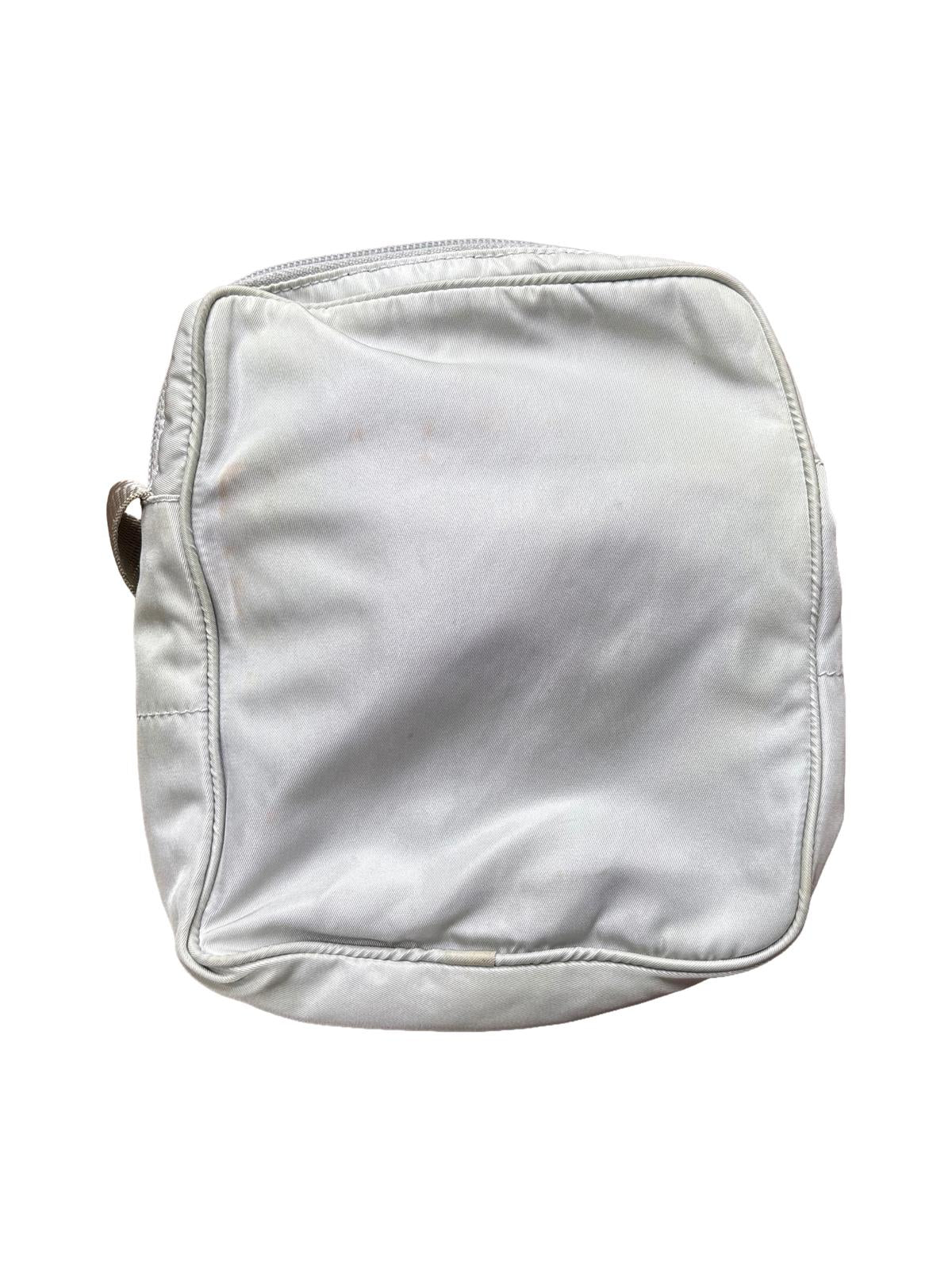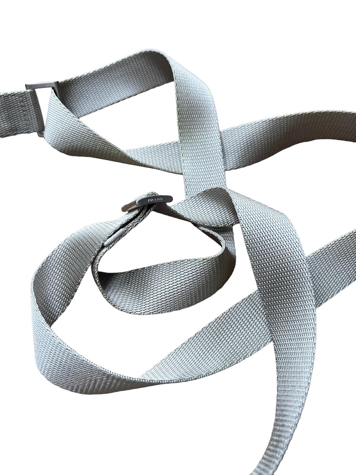 Prada Sport nylon shoulder bag in a light grey colourway with red Prada logo detailing on the front. Compact, functional silhouette that works well as a crossbody or small everyday bag.