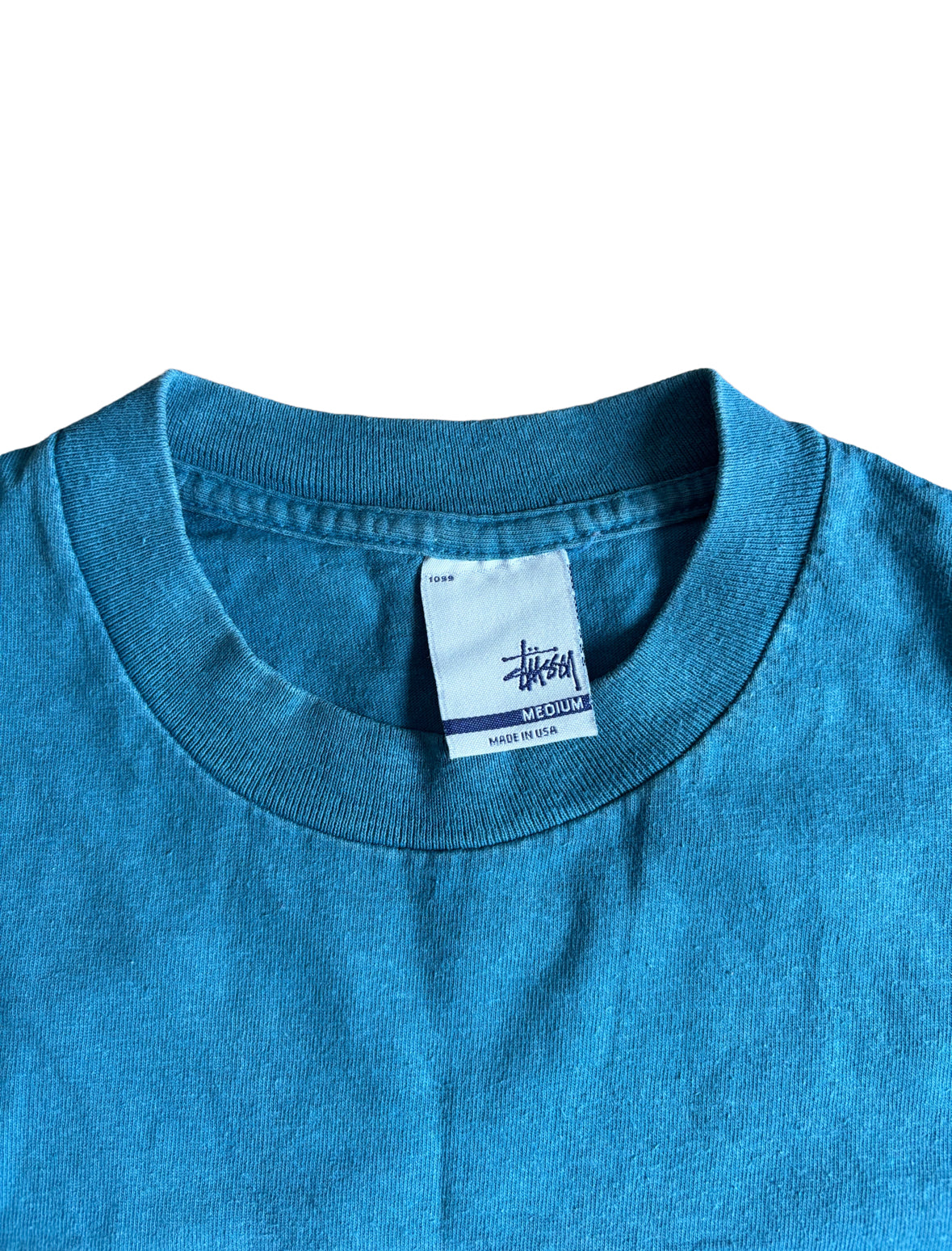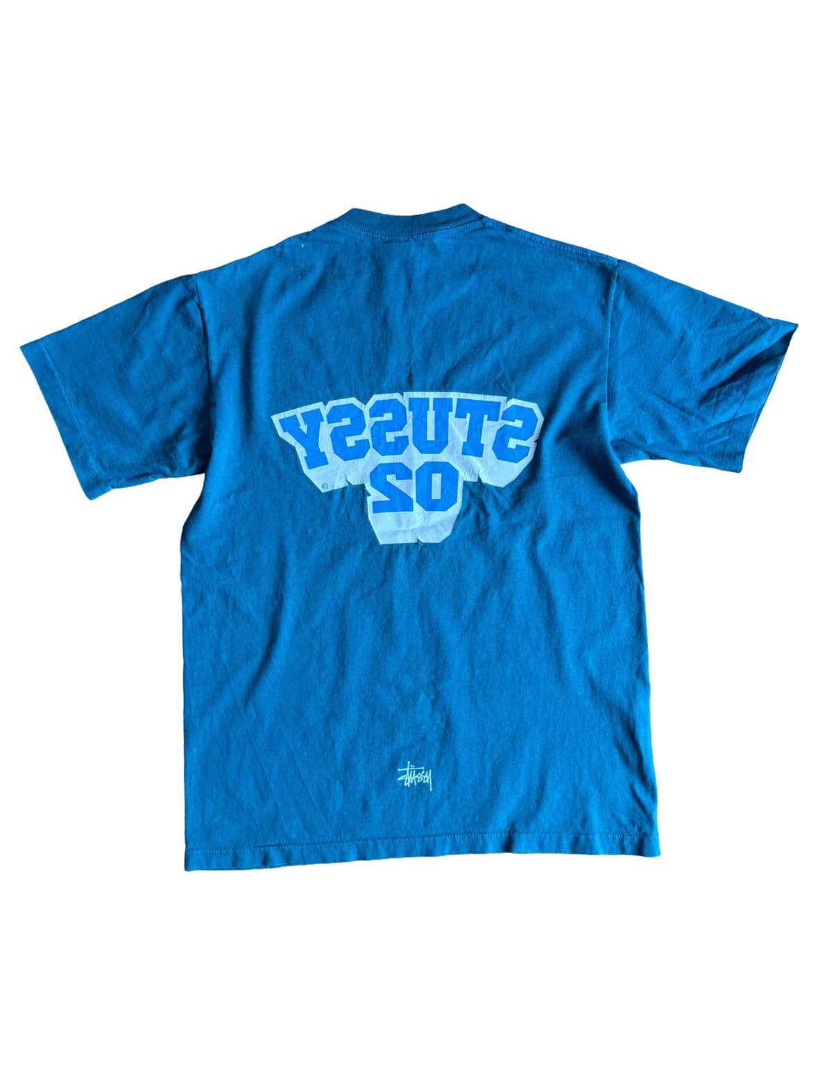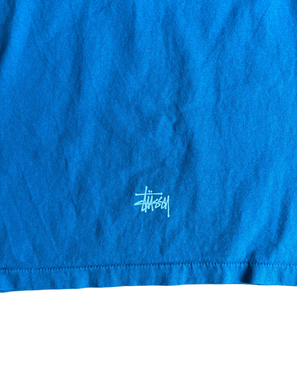 Early 00’s release, blue & white screen print featured on front and black of t-shirt with signature stussy branding on the bottom of the back