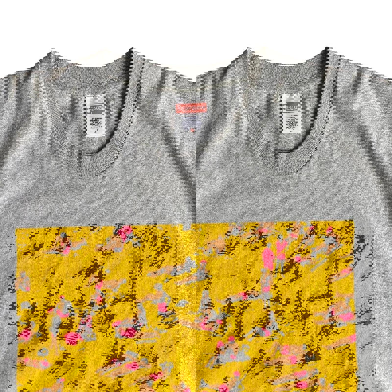 Supreme Spring Summer 2016 Beach t shirt in grey with bold yellow and pink front print. Clean blank with a strong graphic from the SS16 collection.