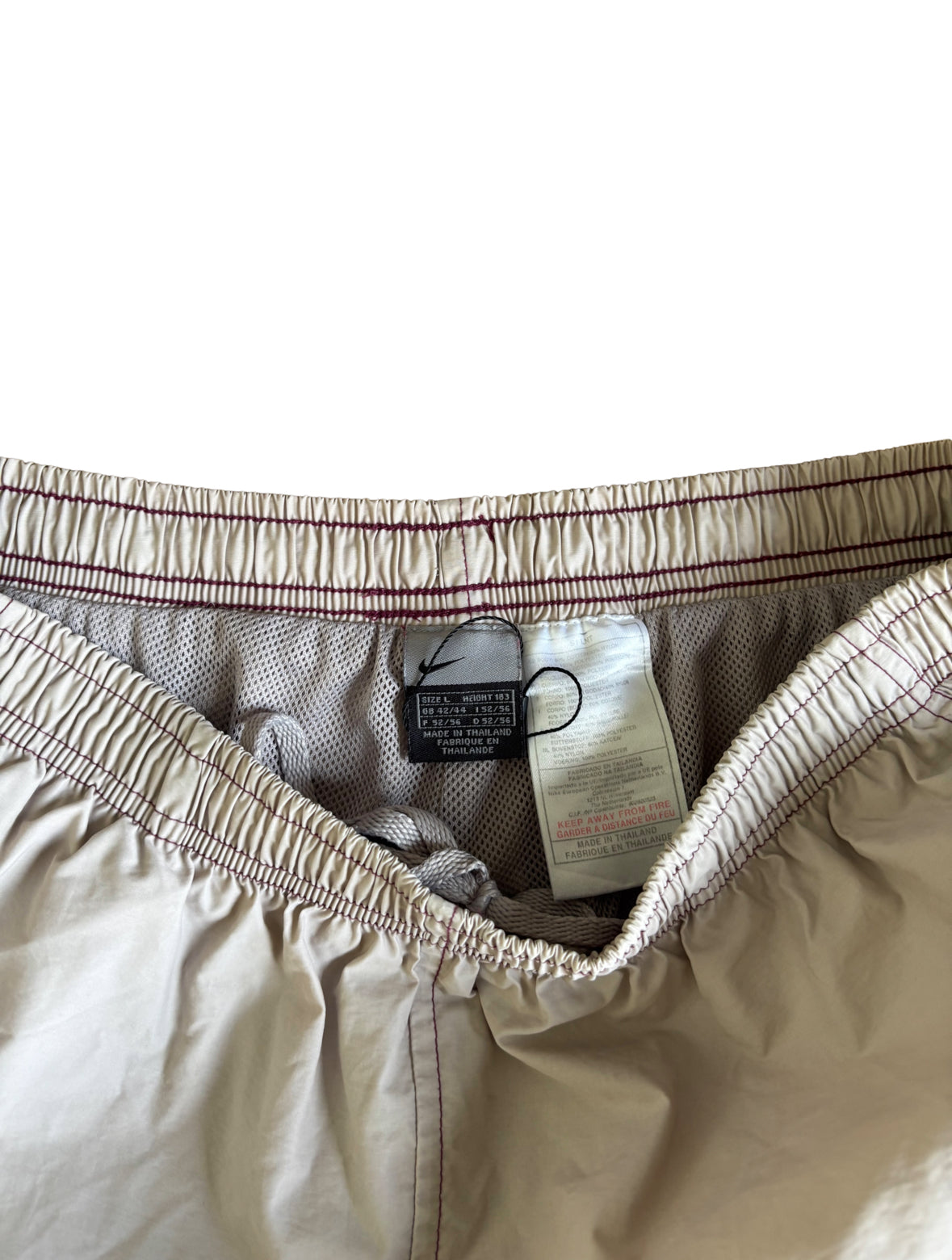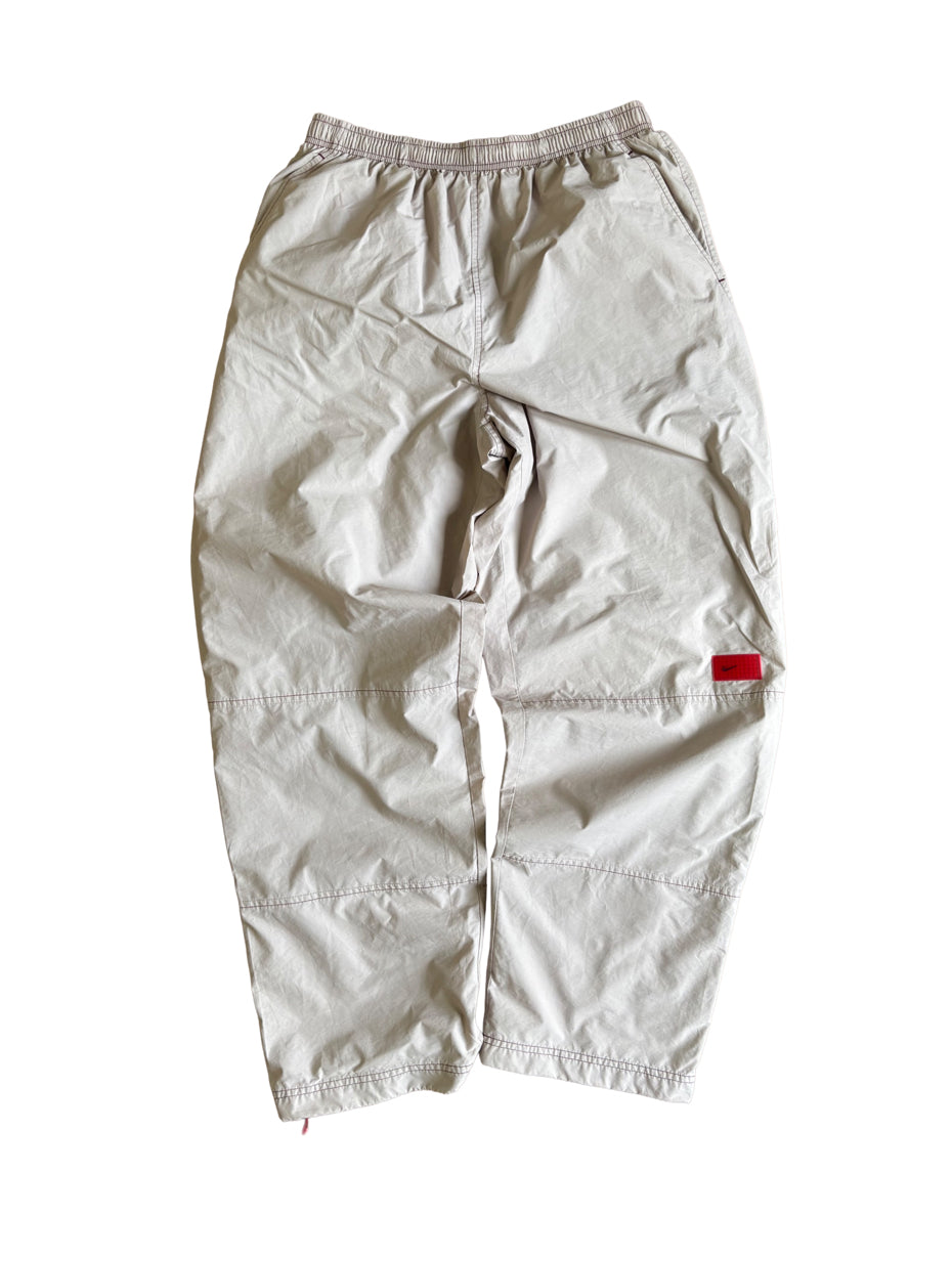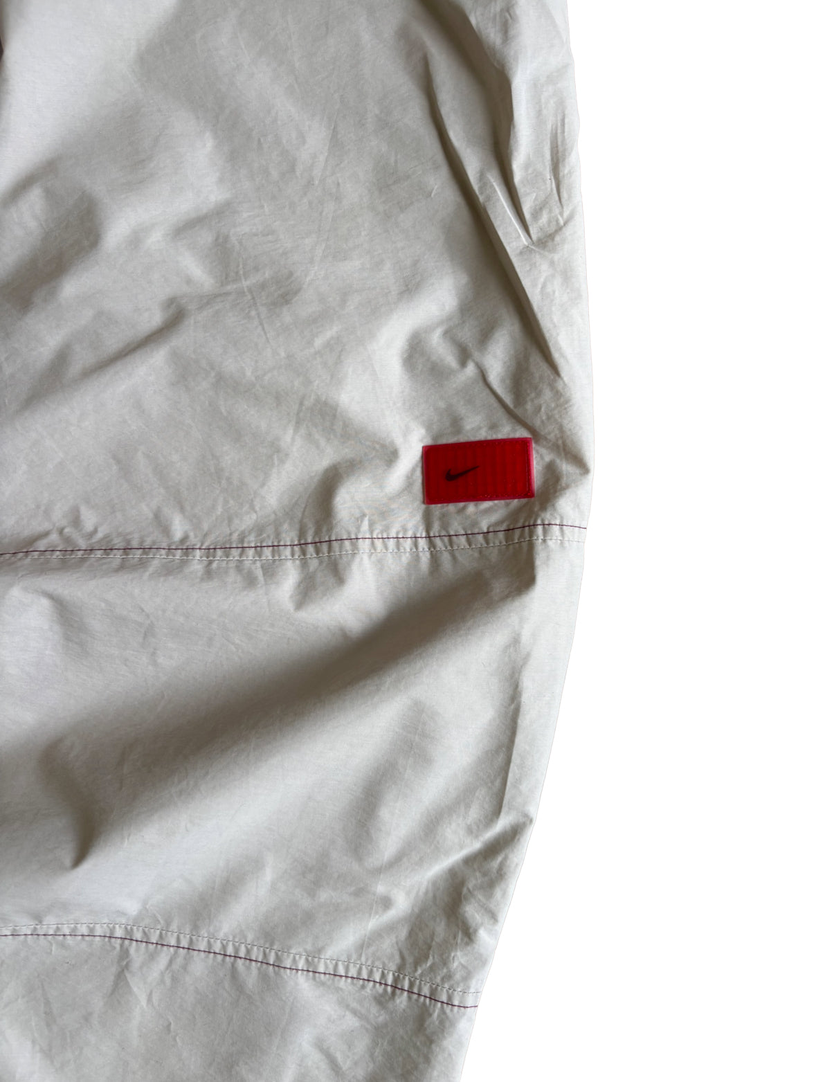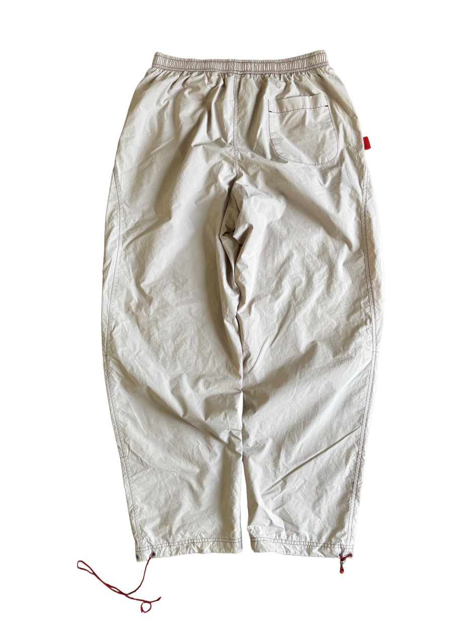 Cream cargo trousers / parachute trousers featuring exposed red contrasting embroidery Perfect condition other than one of the bottom drawstrings coming loose, doesn’t affect the trousers at all if you don’t wish to cinch the bottom